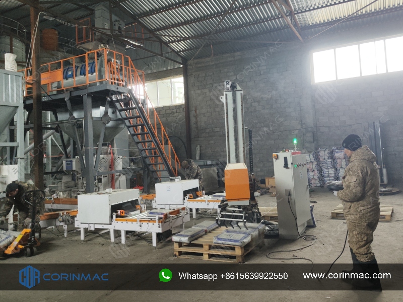 Recently, CORINMAC dry mortar production line project in Kazakhstan successfully completed the installation and commissioning of valve bag packaging machines, column palletizer and a full set of supporting equipment, and officially entered the production stage.
